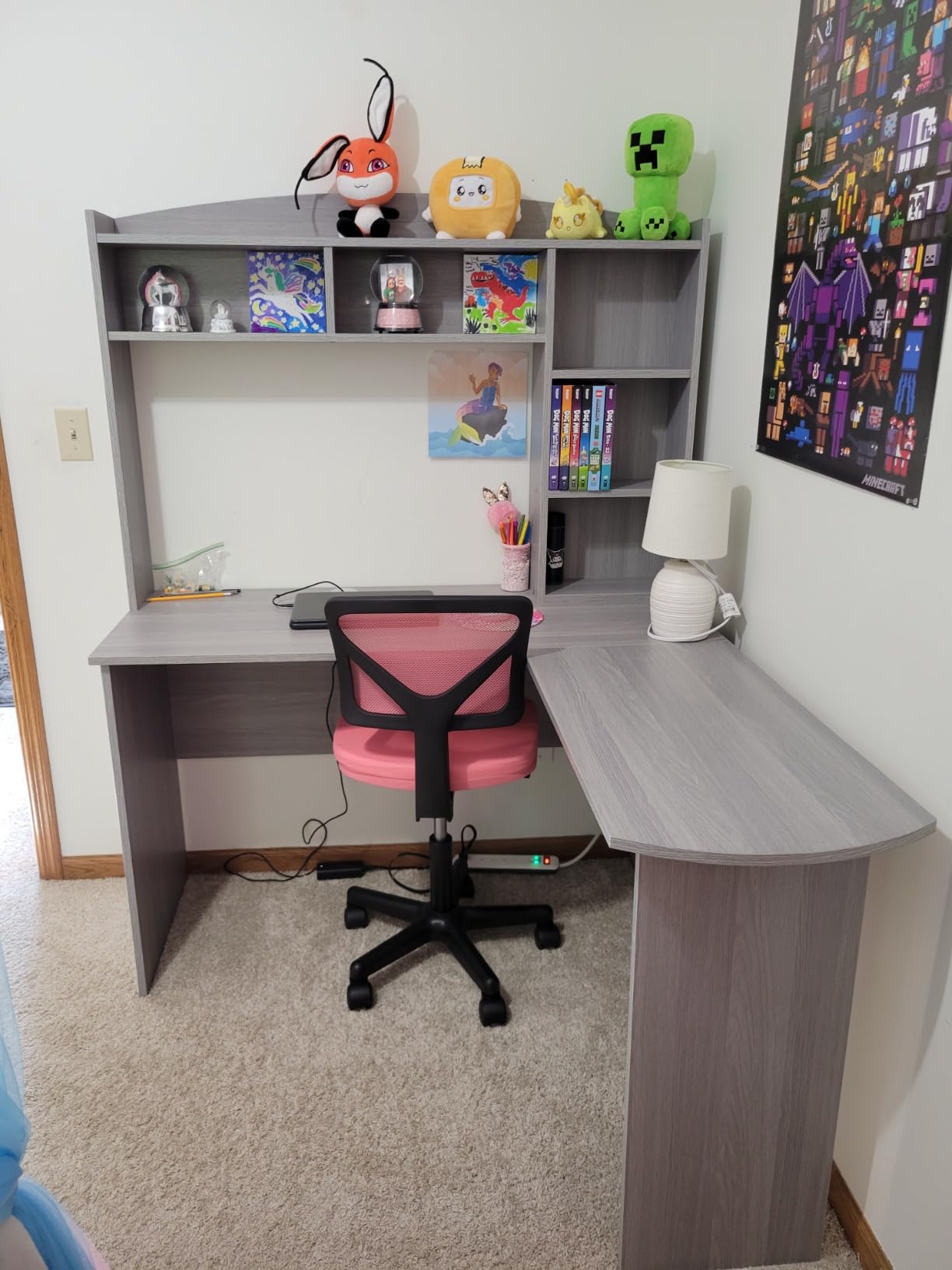 Whether you are working on your big assignment or busy to-do list, Techni Mobili Modern L-Shaped Computer Desk with Hutch is the perfect choice for your home office. Crafted from wooden panels with a Grey laminate surface, it showcases an L-shaped design,  perfect for corner spaces, or making a statement in your office or home office. The integrated hutch features two vertical shelve plus two top open shelves, perfect for storing books, files, or displaying some decorative favorites. This desk supports a weight limit of 110lbs., backed by a 5-year warranty. Color: Grey.