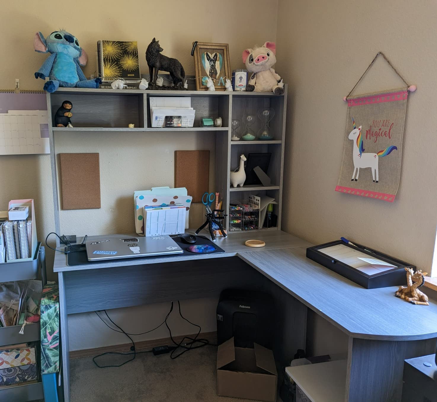 • L-Shaped Computer desk made of wood panels with Grey woodgrain laminated surface