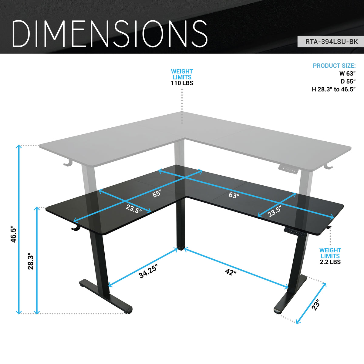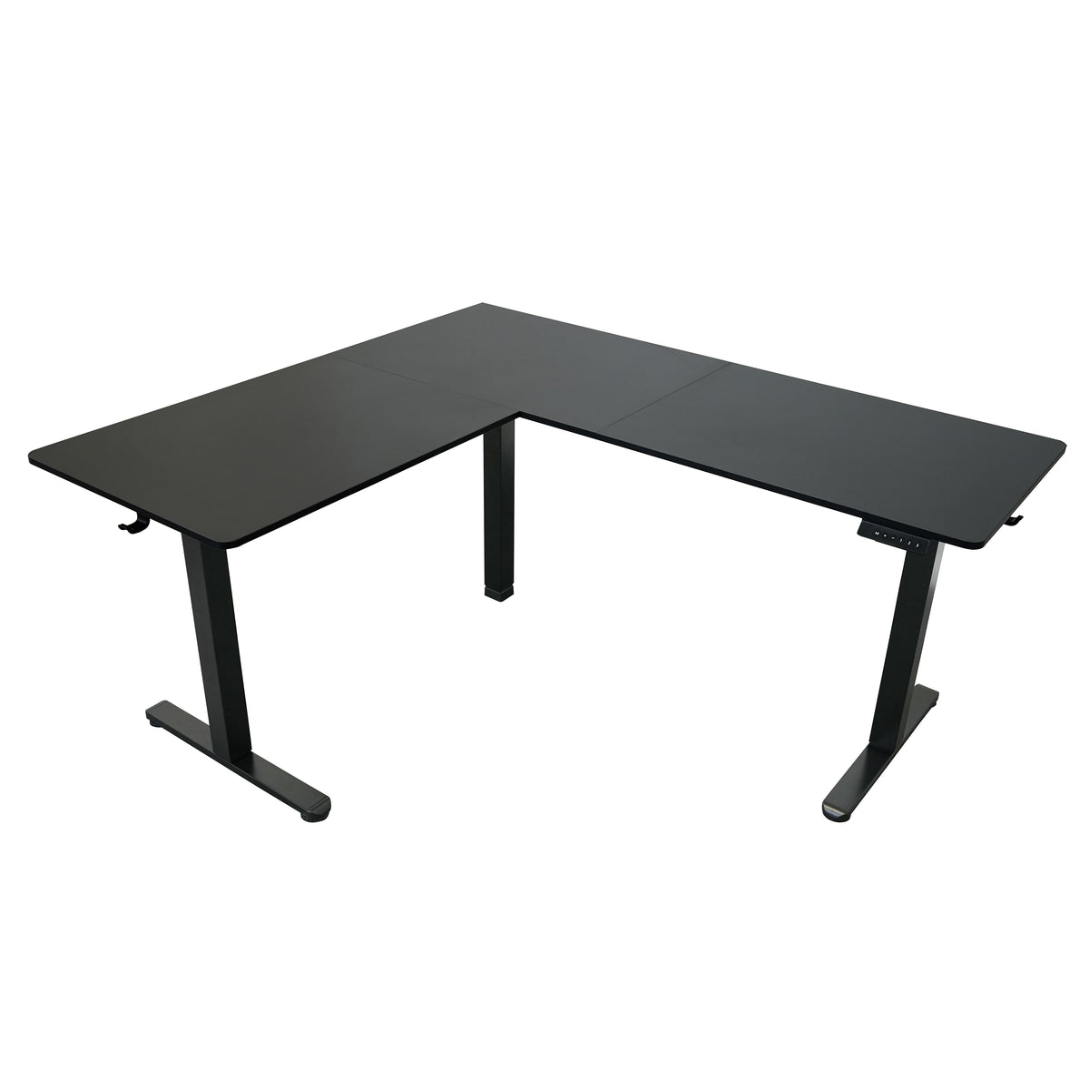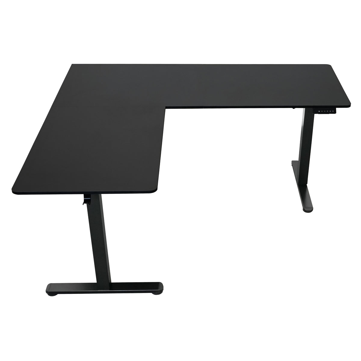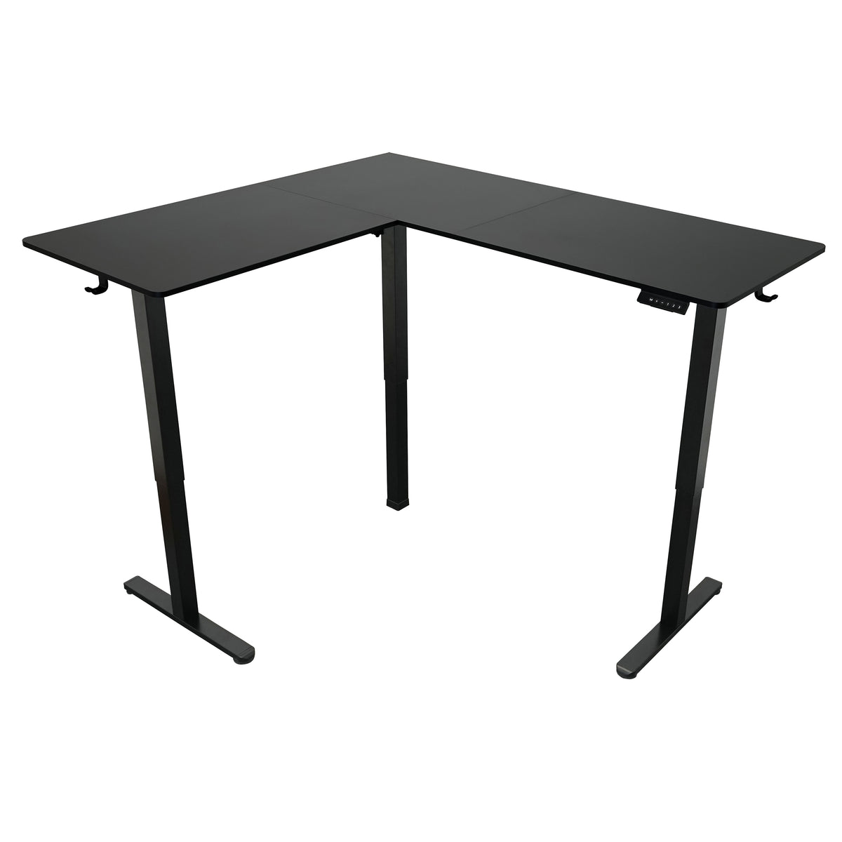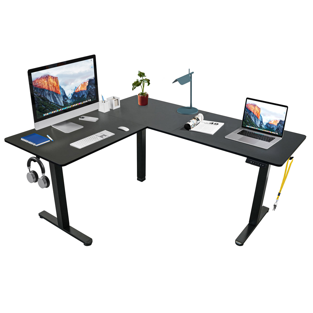 Upgrade your workspace with this L-Shaped Electric Standing Desk built to deliver both functionality and modern style. Designed to fit perfectly into any corner, this spacious black sit-to-stand desk offers ample room for dual monitors, a laptop, and all your daily essentials. The L-shaped layout maximizes surface area while helping you stay organized and focused, whether you're working, gaming, or creating. Equipped with a smooth electric lift system, the workstation easily adjusts from sitting to standing height with the press of a button. Save up to three preferred positions using the built-in memory presets for effortless transitions throughout your day. The durable steel frame supports up to 110 lbs, and two integrated hooks keep headphones, bags, or cables neatly tucked away. Ideal for home offices, studios, or professional setups, this corner desk combines comfort, space, and performance in one streamlined design. Color: Black.