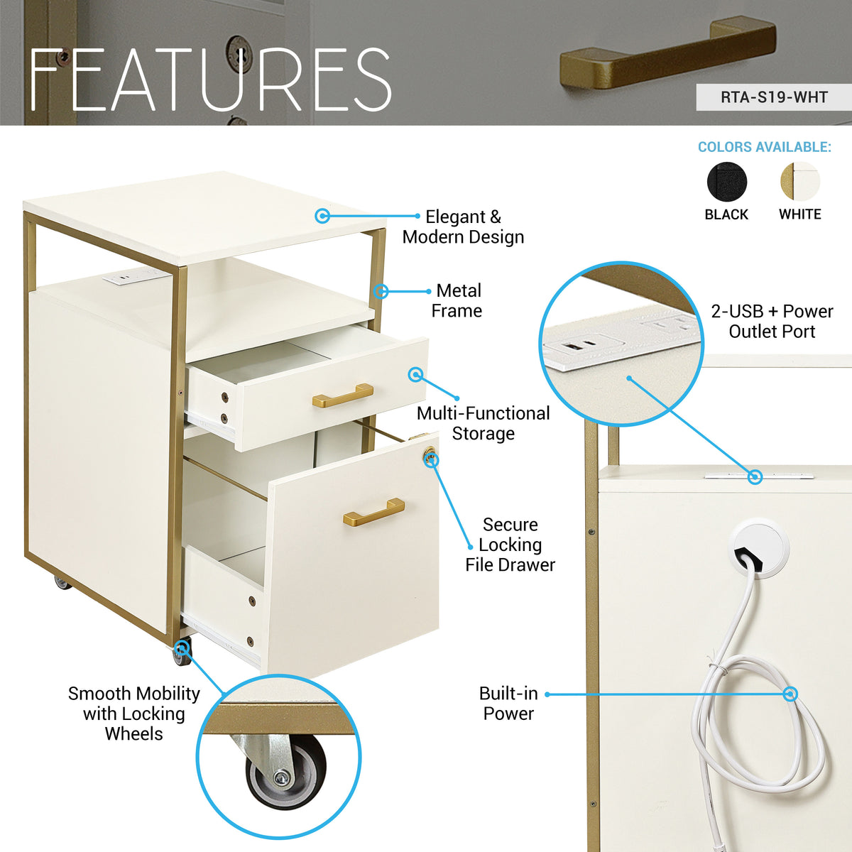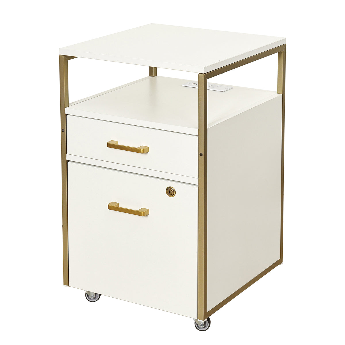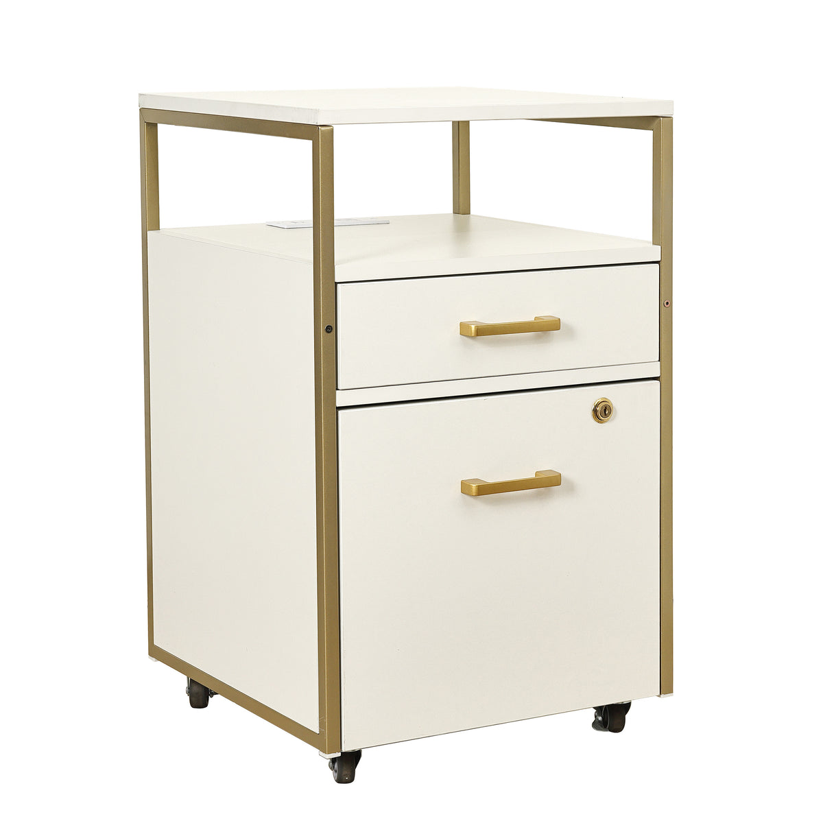 Upgrade your workspace with this stylish and functional rolling file cabinet. Featuring 2 drawers, including a secure locking file drawer for important documents, this cabinet keeps your essentials organized and within reach. The 2 built-in USB ports and a power outlet make it easy to charge your devices without cluttering your desk. Its elegant metal frame and stylish finish complement any office or home setup, while the locking wheels allow you to move the cabinet with ease and then lock in place. Whether you need a mobile workstation or a modern storage solution, this cabinet blends practicality with contemporary design. Color: Black, or White.
