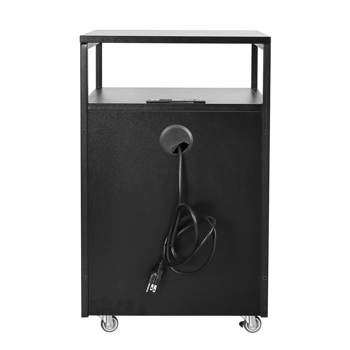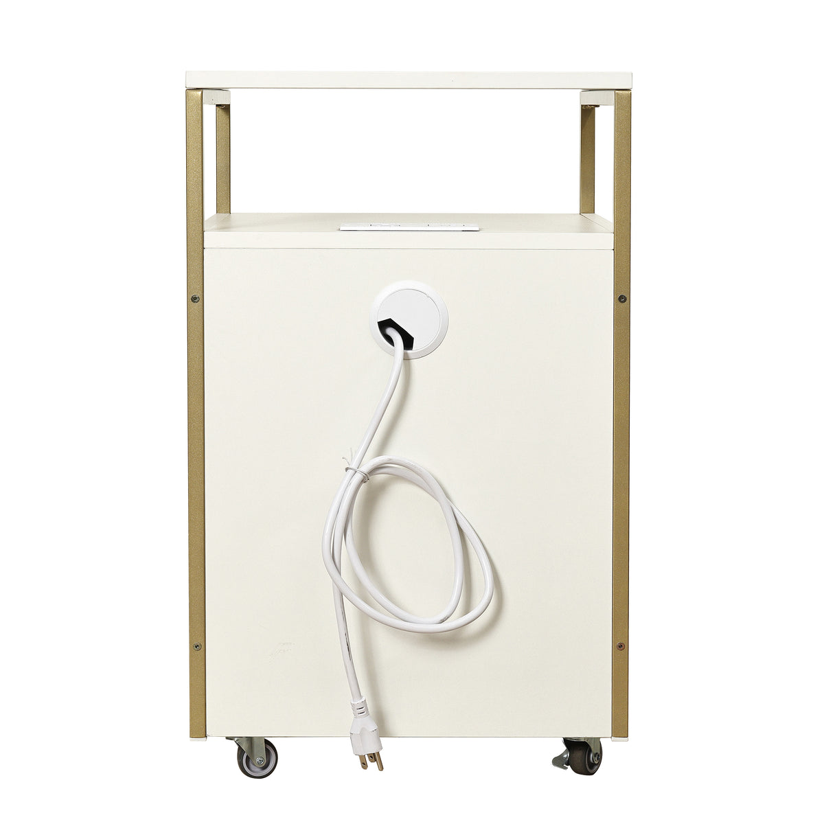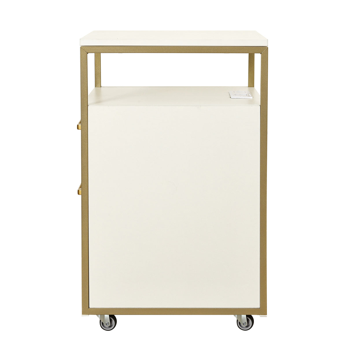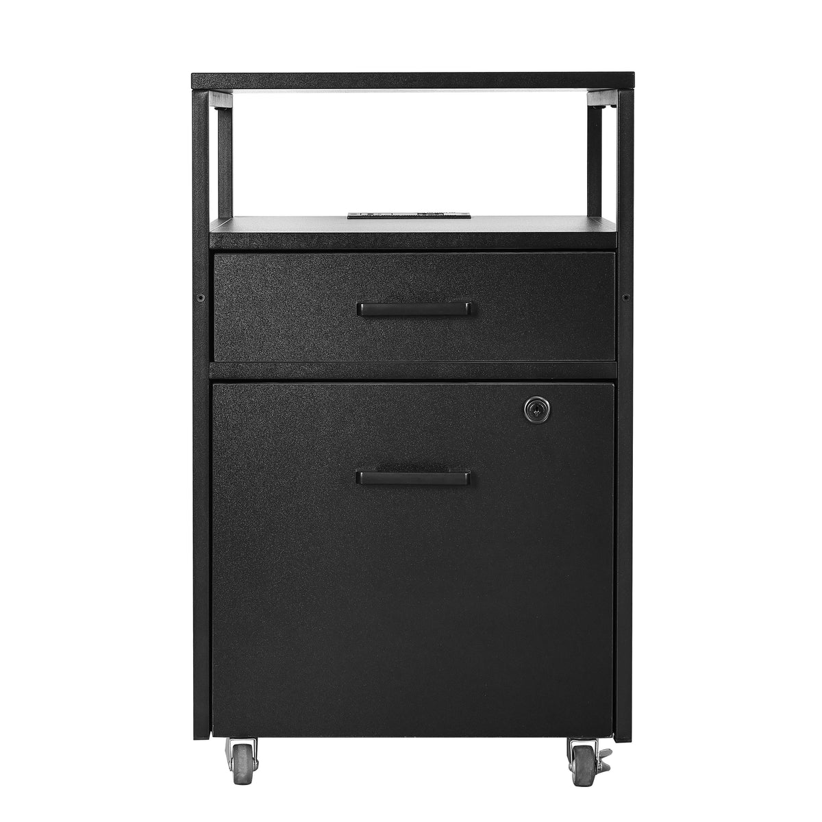 Upgrade your workspace with this stylish and functional rolling file cabinet. Featuring 2 drawers, including a secure locking file drawer for important documents, this cabinet keeps your essentials organized and within reach. The 2 built-in USB ports and a power outlet make it easy to charge your devices without cluttering your desk. Its elegant metal frame and stylish finish complement any office or home setup, while the locking wheels allow you to move the cabinet with ease and then lock in place. Whether you need a mobile workstation or a modern storage solution, this cabinet blends practicality with contemporary design. Color: Black, or White.