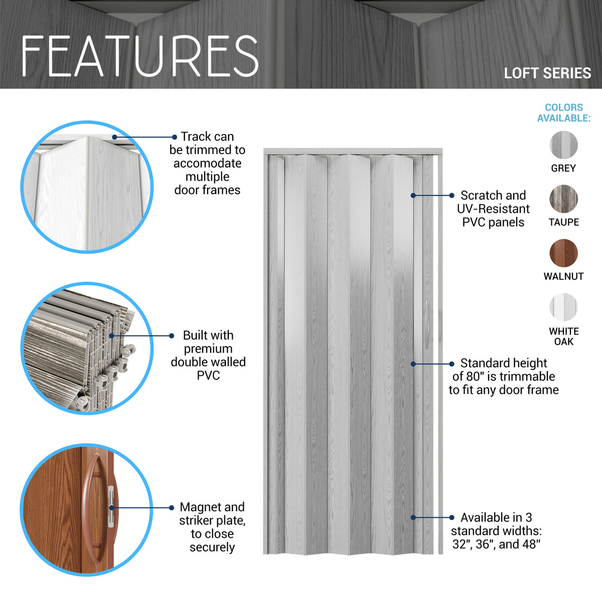 Our premium Loft Series double-walled accordion doors are crafted with durable double-walled high-quality PVC for unmatched durability. The durable, maintenance-free vinyl panels have a scratch/UV-resistant coating that is easy to clean. Each package comes ready to install with all essentials including a track, hardware, door handle, and clear instructions. These robust foldable doors come in three standard widths and are trimmable to fit any door opening in your home or office. Ideal for any interior setting, our premium sliding accordion doors are space-saving and energy-efficient, elevating both the functionality and aesthetic of spaces such as living rooms, bedrooms, or any internal doorway. Colors: Grey, Walnut, White Oak.