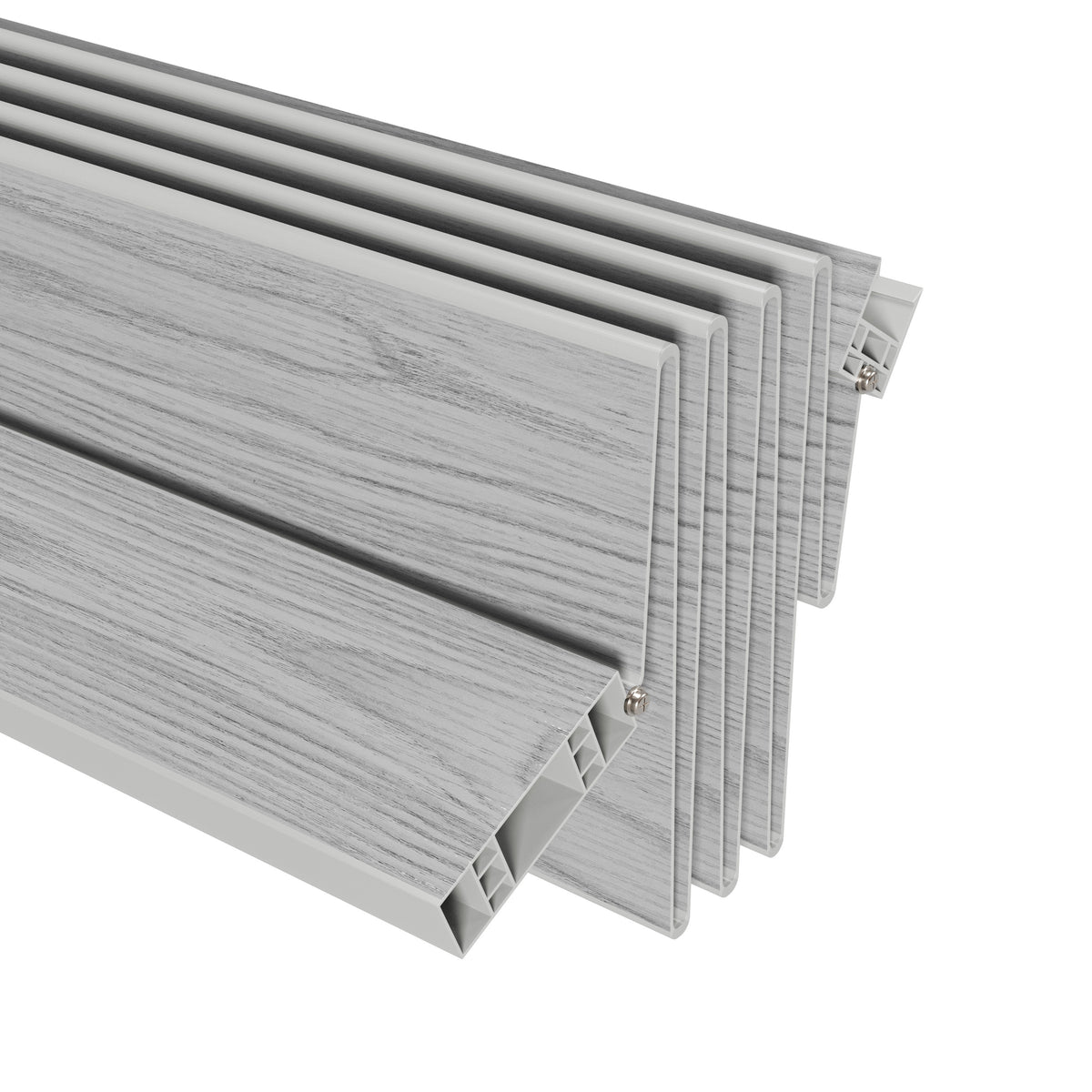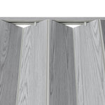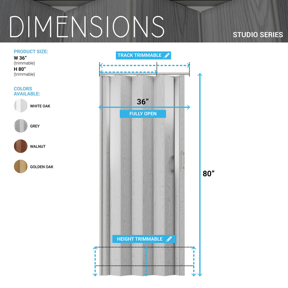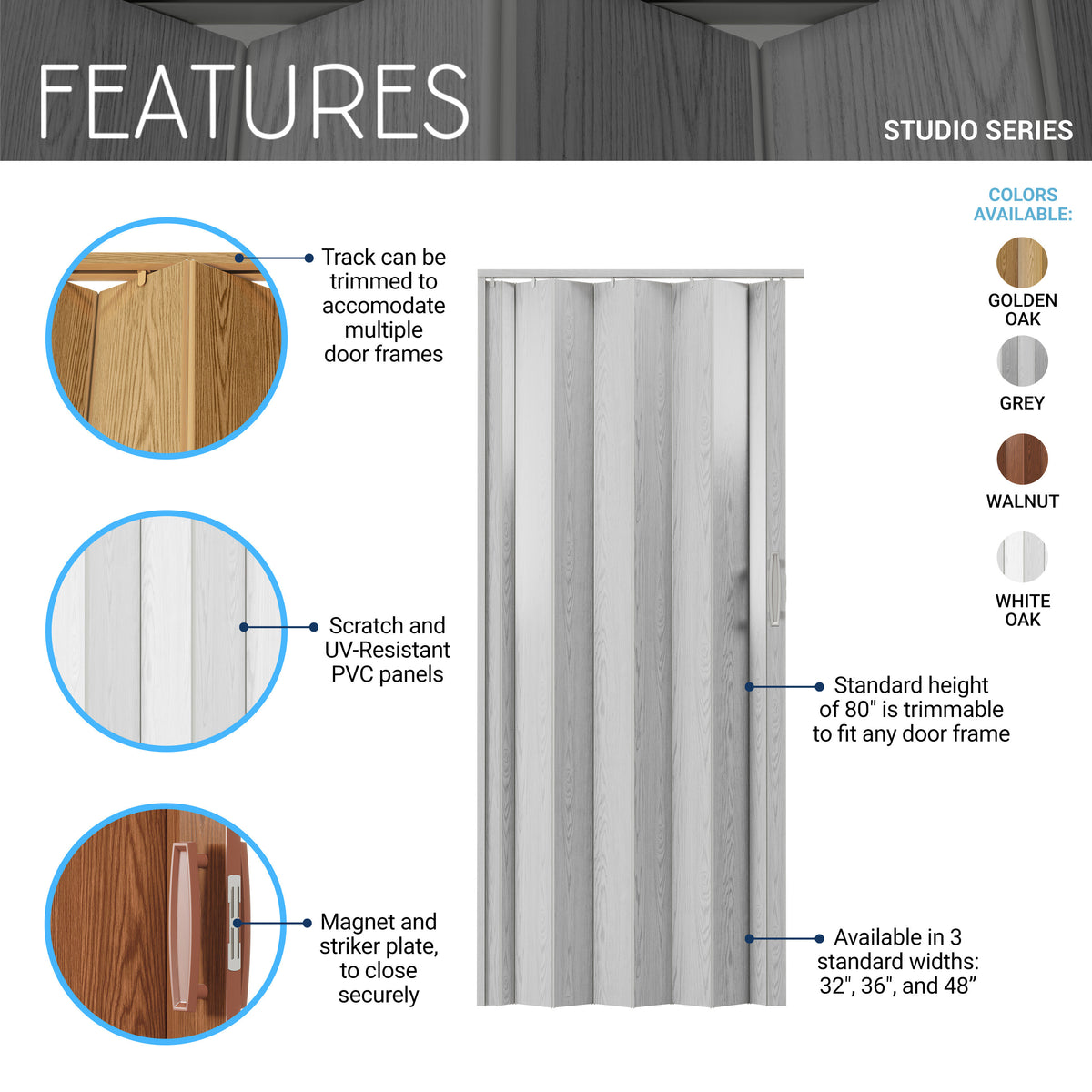 Our Studio Series accordion doors are crafted with high-quality PVC for unmatched durability. The durable, maintenance-free vinyl panels have a scratch/ UV-resistant coating that is easy to clean. Each package comes ready to install with all essentials including a track, hardware, door handle, and clear instructions. These robust foldable doors come in three standard widths and are trimmable to fit any door opening in your home or office. Ideal for any interior setting, our premium sliding accordion doors are space-saving and energy-efficient, elevating both the functionality and aesthetic of spaces such as living rooms, bedrooms, or any internal doorway. Colors: Walnut, White Oak, or Grey.