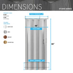 Our Studio Series accordion doors are crafted with high-quality PVC for unmatched durability. The durable, maintenance-free vinyl panels have a scratch/ UV-resistant coating that is easy to clean. Each package comes ready to install with all essentials including a track, hardware, door handle, and clear instructions. These robust foldable doors come in three standard widths and are trimmable to fit any door opening in your home or office. Ideal for any interior setting, our premium sliding accordion doors are space-saving and energy-efficient, elevating both the functionality and aesthetic of spaces such as living rooms, bedrooms, or any internal doorway. Colors: Golden Oak, Grey, White Oak or Walnut.